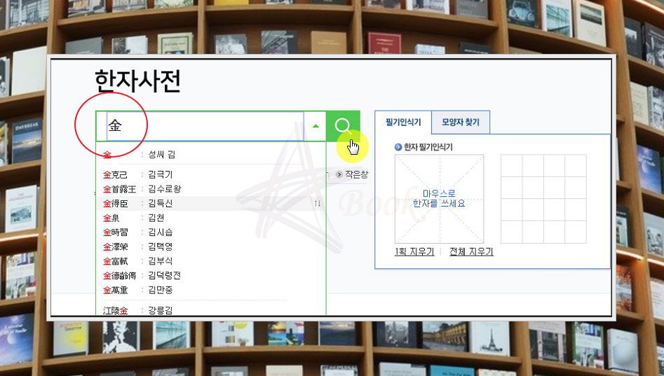 개인적으로 가장 편하게 한자 사전찾기 좋은 방법은 "필기인식기"를 사용하는 것입니다. 알아보고 싶은 문자를 그리기만 하면 돼요. 마우스를 이용하여 필기인식기에 찾아보고자 하는 문자의 모양을 그려 넣어 보세요. 그림과 비슷한 문자가 옆에 나타납니다.