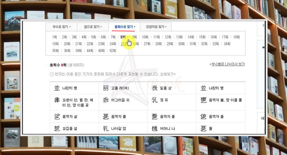 한자의 총획수를 알고 있는 경우에는 '총획수로 찾기' 방식을 이용해 보세요. 총획수를 지정하면 여기에 해당하는 모든 문자가 나타납니다.