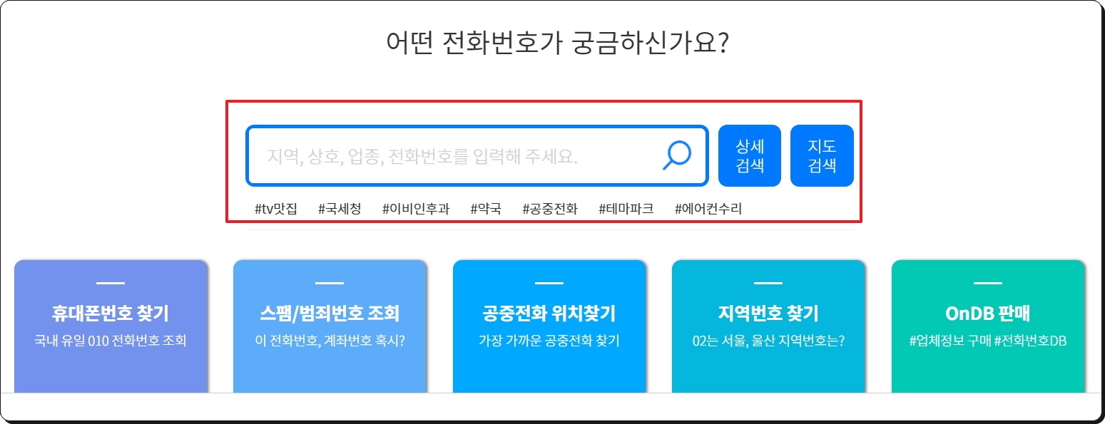 사이트에 접속하면 검색창이 하나 나타납니다. 여기에 지역, 업종, 번호, 상호명 중에 하나를 입력해 주세요. 바로 아래에 보면 휴대폰번호 찾기, 스팸번호 조회, 지역번호 찾기 등 다양한 서비스가 마련되어 있으니 함꼐 이용해 보세요.