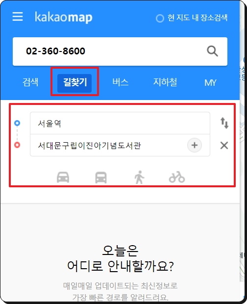 추가적으로 전화를 건 곳으로 찾아가야 할 때 도움이 되는 기능을 소개해 드릴꼐요. [길찾기] 기능을 사용하면 편리한데요. 자가용, 대중교통, 도보, 자전거 이렇게 4가지 교통수단으로 그곳을 가려고 할 때 어떻게 가면 되는지 길을 알려줍니다. 저는 대중교통을 선택했는데요. 이동하는 시간과 거리, 발생하는 요금 등 제대로 찾아가기에 도움이 되는 정보를 제공 받을 수 있었어요.