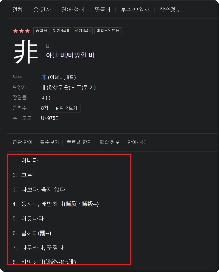 하나의 한자에 대해 자세하게 사본 정보를 알아보고 싶을 때에는 네이버 한문 사전 사이트가 정말 좋은데요. 많은 뜻은 물론이고, 선택한 천자문 한자에 대한 부수나 모양자, 총획수, 학습정보 등 한문 학습에 도움이 되는 자료가 많이 있습니다.