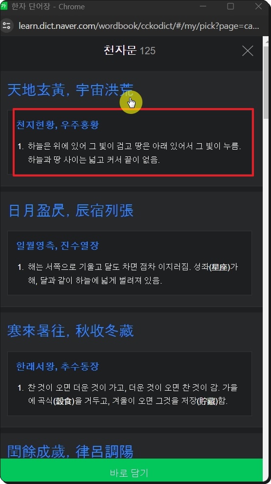 이렇게 천자문에 속한 모든 문장을 찾아볼 수 있는데요. 여기서 문장을 선택하면 개별 한자에 대한 자세한 사전 정보를 확인할 수 있습니다.