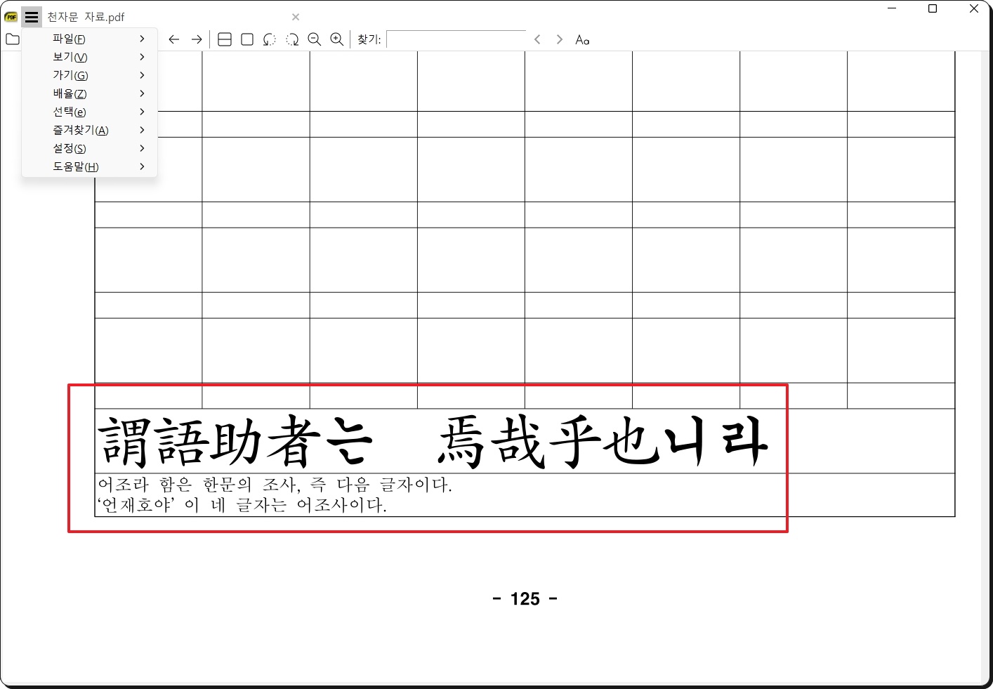 천자문 자료는 총 126 페이지로 구성되어 있는데요. 한 페이지 다 여덟 개의 문자로 되어 있기 때문에 얼추 1000자가 됩니다. 한자교본에는 매 문장마다 이렇게 관련 풀이 또는 학습 내용이 포함되어 있기 때문에 한자교본으로 사용하기에 정말 좋습니다. 마지막 페이지는 자유롭게 자신이 원하는 것을 쓸 수 있도록 빈 칸 구성이 되어 있습니다. 해당 자료는 PDF 파일로 되어 있기 때문에 PDF 뷰어를 사용하여 열 수 있어요.