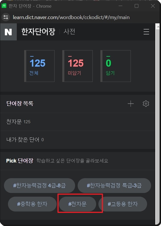 한문 단어장 컨텐츠가 열렸는데요. 직접 단어장을 제작하는 것도 가능하고, 이처럼 미리 만들어진 단어장을 이용할 수 있습니다. 여기에는 천자문이 속해 있는데요. 클릭해 보도록 하겠습니다.
