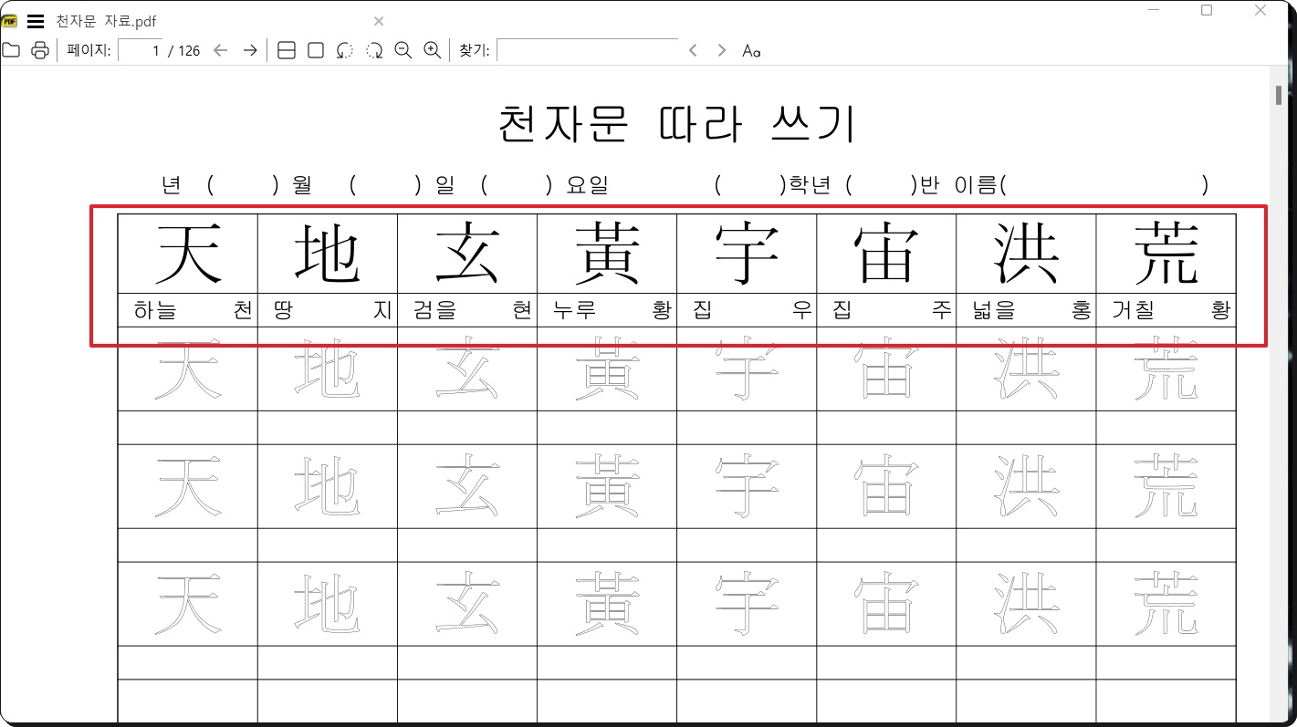 천자문 자료는 총 126 페이지로 구성되어 있는데요. 한 페이지 다 여덟 개의 문자로 되어 있기 때문에 얼추 1000자가 됩니다. 한자교본에는 매 문장마다 이렇게 관련 풀이 또는 학습 내용이 포함되어 있기 때문에 한자교본으로 사용하기에 정말 좋습니다. 마지막 페이지는 자유롭게 자신이 원하는 것을 쓸 수 있도록 빈 칸 구성이 되어 있습니다. 해당 자료는 PDF 파일로 되어 있기 때문에 PDF 뷰어를 사용하여 열 수 있어요.