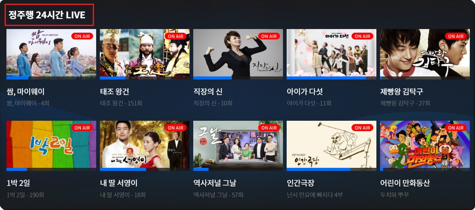 이곳에서 실시간으로 방송보기 가능한 채널은 KBS1 외에도 여러 가지가 있는데요. 2채널, 뉴스 채널, 드라마 채널 등 꽤 많이 있습니다. 하루 종일 심심하고 시간이 많이 남을 때는 정주행 24시간 라이브 채널을 이용해 보세요. 많은 인기를 끌던 유명한 프로그램을 하루 종일 볼 수 있는 채널인데요. 쌈, 마이 웨이, 태조 왕건, 직장의 신, 아이가 다섯, 제빵왕 김탁구 등 재미있는 작품이 많이 있습니다.