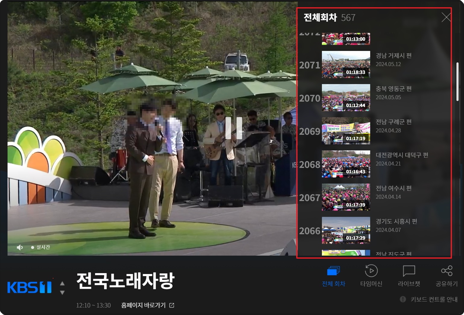 KBS1 채널을 함께 보고 있는 사람들과 채팅을 통하여 대화를 나눌 수 있습니다. 관심 있는 방송을 보면서 여러 가지 의견을 나누는 재미가 솔솔해요. 전체 회차 메뉴를 선택해 보세요. 그럼 이렇게 과거에 KBS1 채널에서 방영이 되었던 것을 다시 보기 가능합니다. Time Machine 기능의 경우에는 현재 보고 있는 방송에 대하여 시점 조절을 할 수 있는 것을 말합니다.