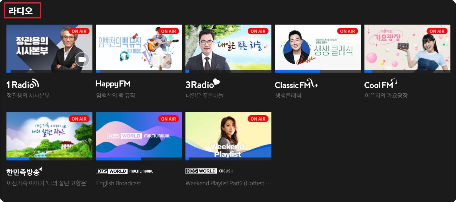 요즘에는 라디오 방송도 인터넷으로 들을 수 있는데요. 실시간 감상이 가능한 온에어 서비스가 여덟 개나 되네요. 라디오를 좋아하는 분이라면 KBS1 채널과 함께 이용해 보세요.