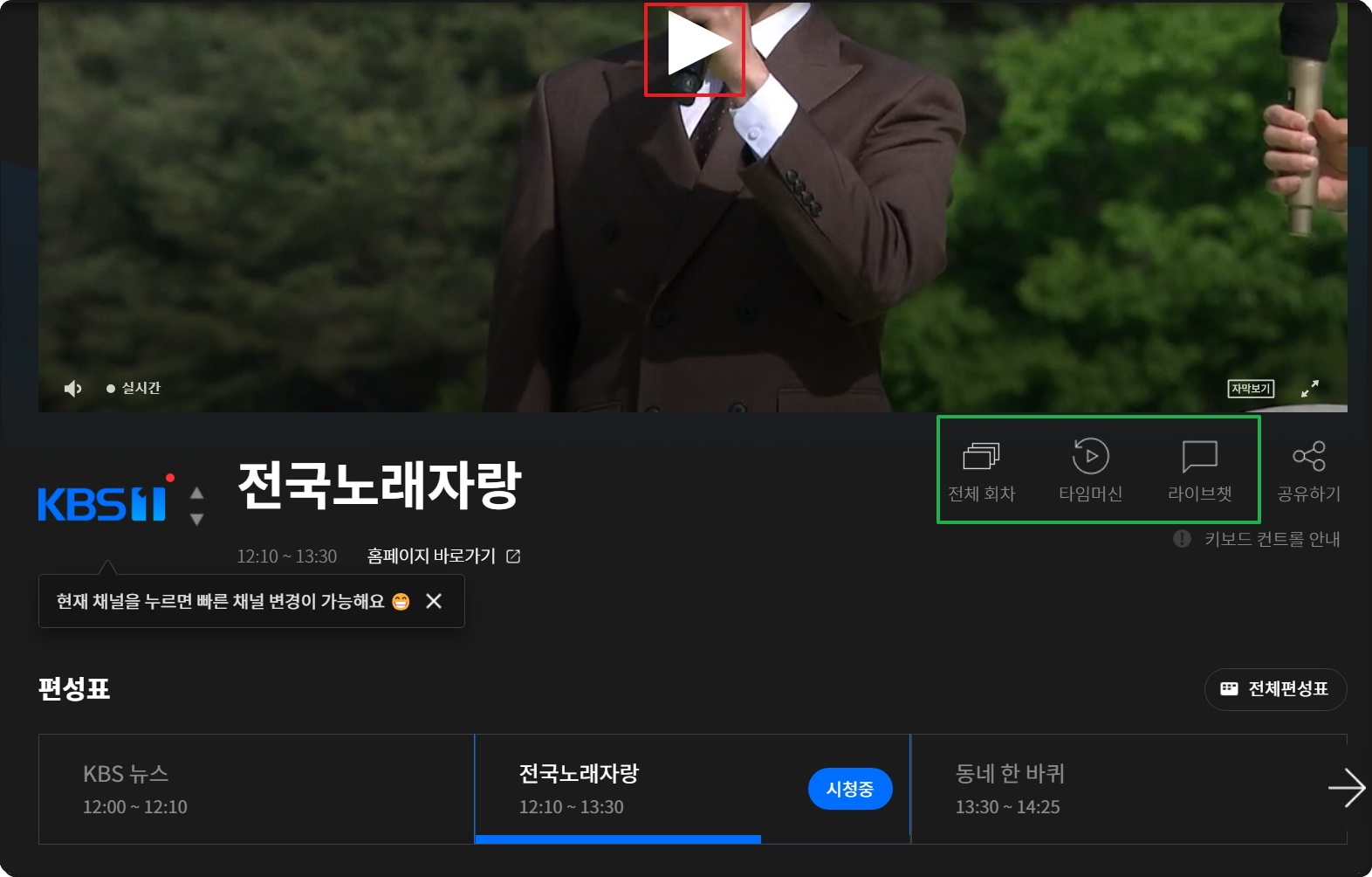 KBS1 채널을 함께 보고 있는 사람들과 채팅을 통하여 대화를 나눌 수 있습니다. 관심 있는 방송을 보면서 여러 가지 의견을 나누는 재미가 솔솔해요. 전체 회차 메뉴를 선택해 보세요. 그럼 이렇게 과거에 KBS1 채널에서 방영이 되었던 것을 다시 보기 가능합니다. Time Machine 기능의 경우에는 현재 보고 있는 방송에 대하여 시점 조절을 할 수 있는 것을 말합니다.