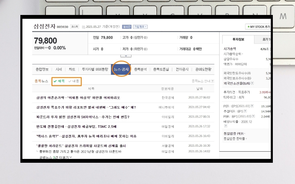 실시간으로 해당 주식에 관련된 뉴스 및 공시 자료도 볼 수 있는데요. 제목으로 검색했을 때 기사가 많지 않다면 [내용] 탭을 클릭해 보세요. 그럼 기사에 해당 주식 종목의 이름이 포함된 기사를 모두 만나볼 수 있습니다.