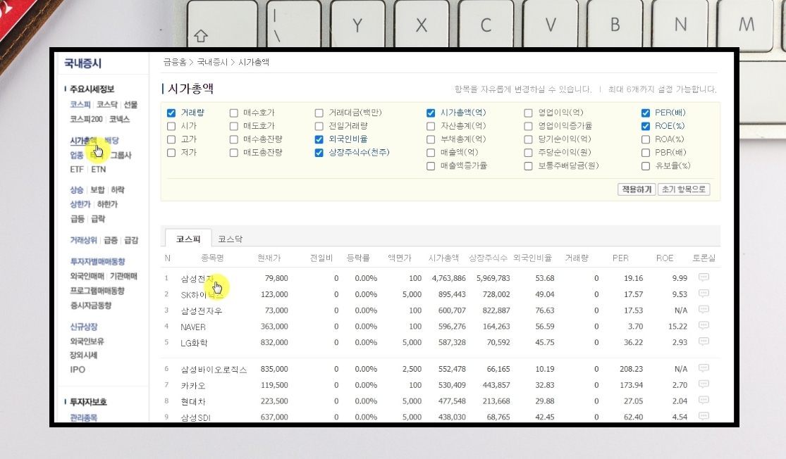 일단 시가총액 순으로 종목을 살펴보도록 하겠습니다. 최근 가장 많은 주목을 받고 있는 삼성전자의 시가총액이 가장 높네요. 해당 리스트를 통해 현재가, 전일비, 등락률, 액면가, 외국인비율 등 여러 가지 정보를 확인할 수 있습니다.