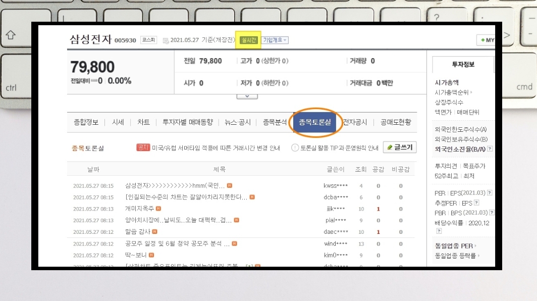 주식 투자를 할 때 조금 심심하면 종목토론실을 이용해 보세요. 여러 사람들과 의견을 나눌 수 있는 곳입니다. 이런 식으로 실시간 주식 현재가와 함께 여러 가지 정보를 이용해 보세요.
