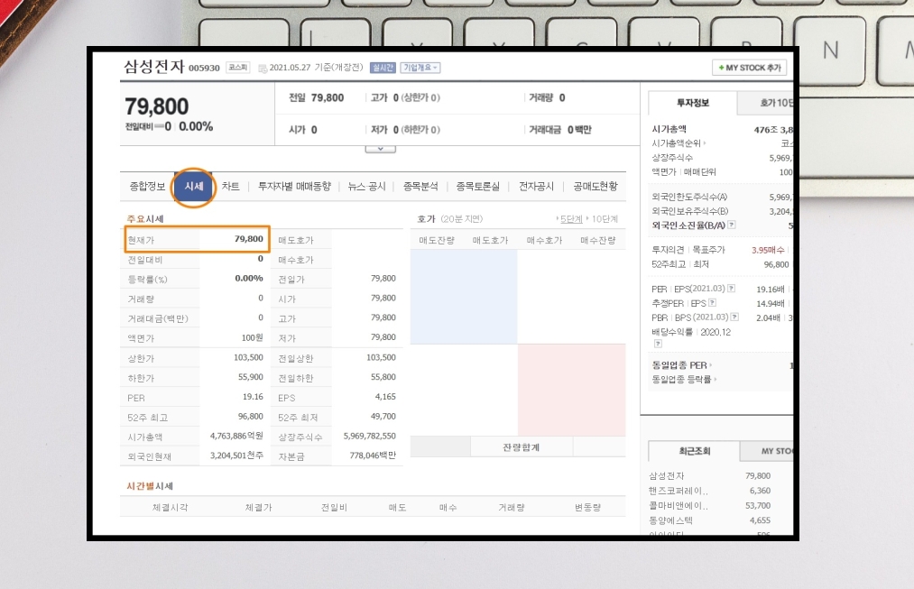 삼성전자 종목 페이지를 보면 여러 메뉴를 선택할 수 있게 되어 있습니다. 여기에서 시세를 클릭해 보세요. 그럼 현재가와 더불어 전일대비, 등락률, 거래량, 거래대금 등 주식 시세를 전반적으로 확인할 수 있습니다.
