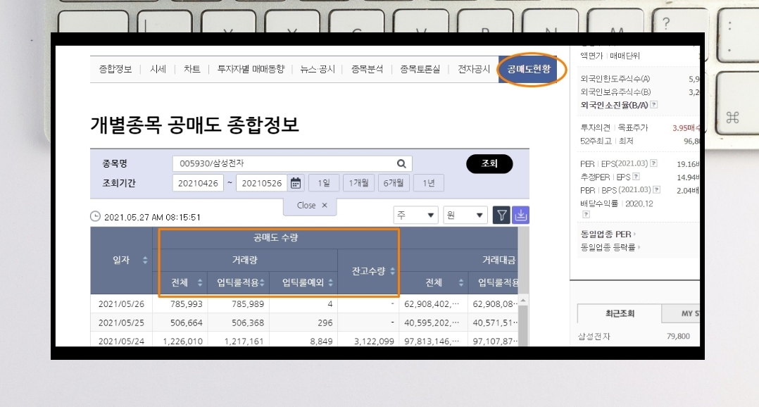 요즘 공매도 관련 뉴스가 많이 거론되고 있는데요. 네이버 증권 사이트를 통해 개별종목 공매도 종합정보를 확인할 수 있습니다. 삼성전자의 경우 최근에 공매도 수량이 좀 늘어난 것을 확인할 수 있습니다.