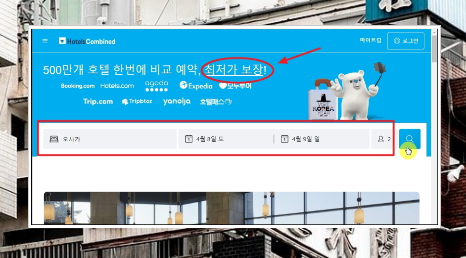 해당 사이트에 접속하면 메인화면에 나타나 있듯이 최저가를 보장해 준다고 해요. 일본 호텔 예약을 저렴하고 싶을 때 꽤 유용한 기능이죠. 사이트 이용 방법도 간단해요. 머무르려고 하는 지역, 날짜, 숙박 인원을 입력한 후 검색 버튼을 누르면 돼요. 일본의 오사카에 있는 숙소를 한 번 찾아볼게요.