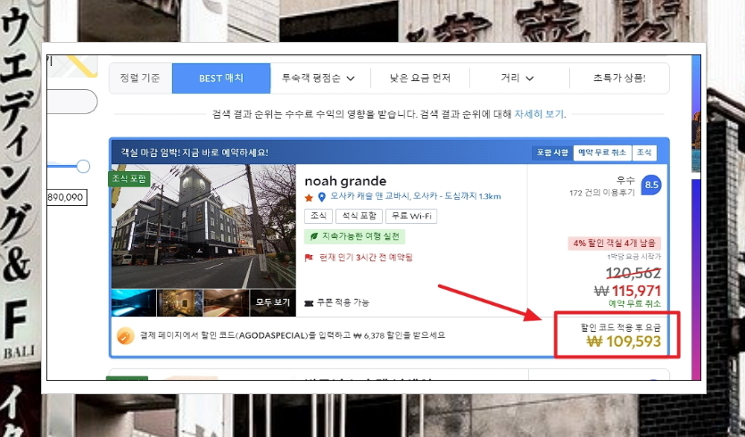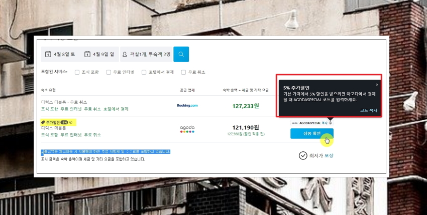 아고다와 부킹닷컴 이렇게 2가지 사이트를 가격비교하여 더 싸고, 혜택이 많은 곳을 선택할 수 있는데요. 아고다의 경우 5% 추가 할인을 받을 수 있다고 하네요. 여기에 나온 코드를 복사한 후 [상품 확인]을 누르면 나오는 웹페이지에 코드를 붙여 넣으면 돼요.