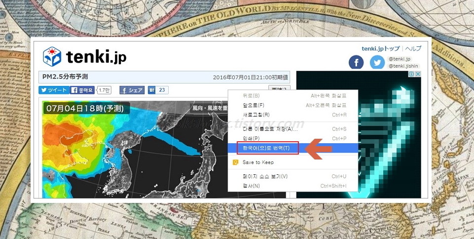 실시간 위성지도만 보아도 어느 지역의 미세먼지 농도가 높은지 쉽게 파악할 수 있는데요. 그래도 좀 더 편하게 보시려면 Google Chrome에서 한국어 번역 기능을 이용하시길 바랍니다.