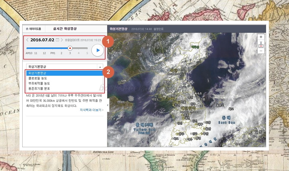 ①을 통해 날짜와 시간을 지정한 후 재생버튼을 누르시면 실시간 영상이 나옵니다. 위에 나오는 위성지도는 기본영상이고, 추가적으로 클로로필 농도, 부유퇴적물 농도, 용존유기물 분포를 확인하실 수 있니다.