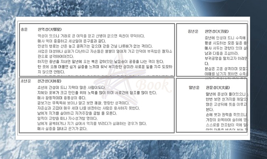 일반적으로 평생운을 알려면 당사주를 보는 것이 좋다고 알려져 있는데요. 풀이를 보시면 초년, 중년, 말년 그리고 전체 인생의 운세를 파악하실 수 있습니다. 자신의 성격이나 조심해야 할 것들에 대한 내용이 많습니다.