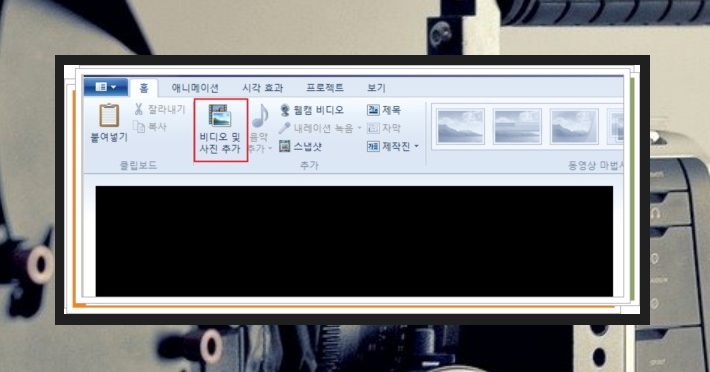 ▼ 무비메이커를 실행한 화면입니다. [비디오 및 사진 추가]를 누른 후 기념일 동영상에 포함시키고 싶은 사진이나 비디오 파일을 선택하고 확인 눌러주세요.