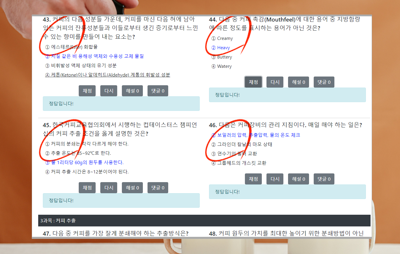 10. 바리스타 2급 시험 준비를 하기에 시간이 부족한 사람들은 교사용 자료를 활용해 보세요. 문제에 답이 표시되어 있기 때문에 훑어 보기에 유리합니다. 문제를 푸는 것보다 각 문항을 훑어보는 것이 시간적으로 절약이 많이 됩니다.