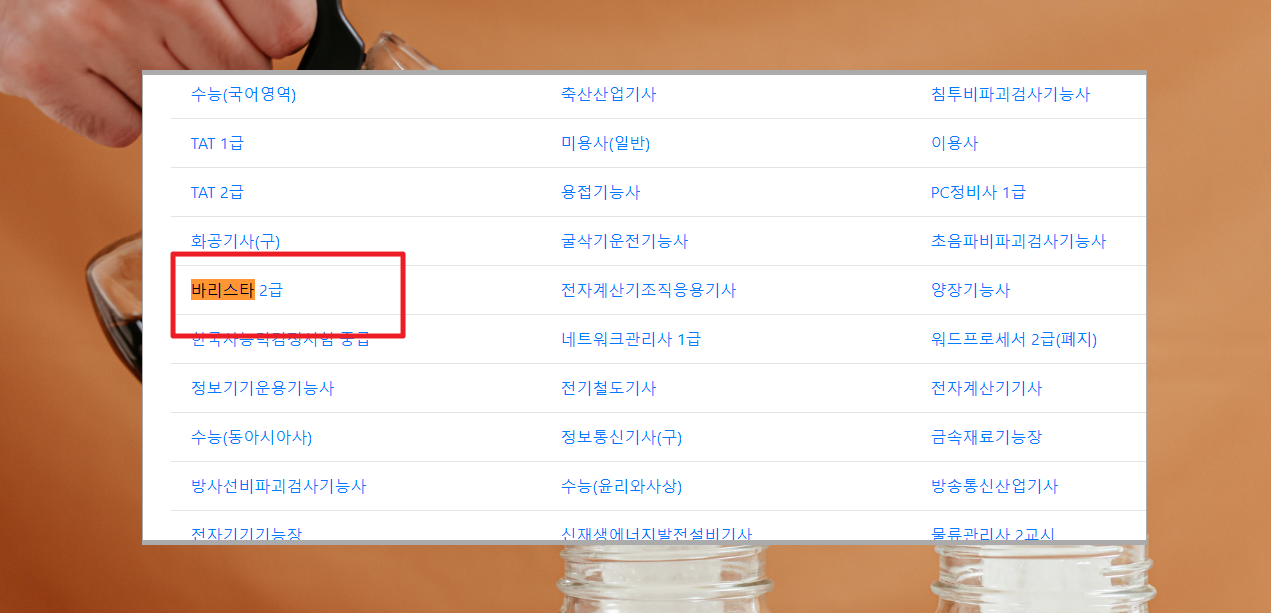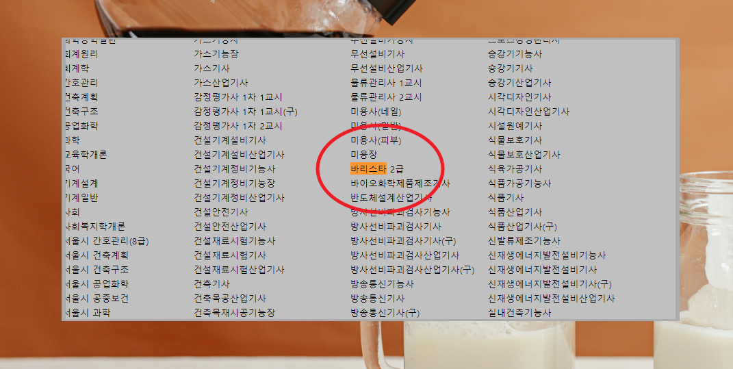 3. 일단 처음에 사이트에 접속하면 여러 가지 자격증 리스트가 나타납니다. 여기에서 바리스타 2급 자격증 자료를 찾아야 하는데요. 바로 눈에 띄지 않으니 검색 기능을 사용해 주세요. 인터넷 브라우저에서 컨트롤+F 키를 사용하면 검색을 할 수 있습니다. 저는 바리스타로 검색을 했는데요. 이렇게 찾은 서비스 메뉴를 마우스로 클릭해 주세요.