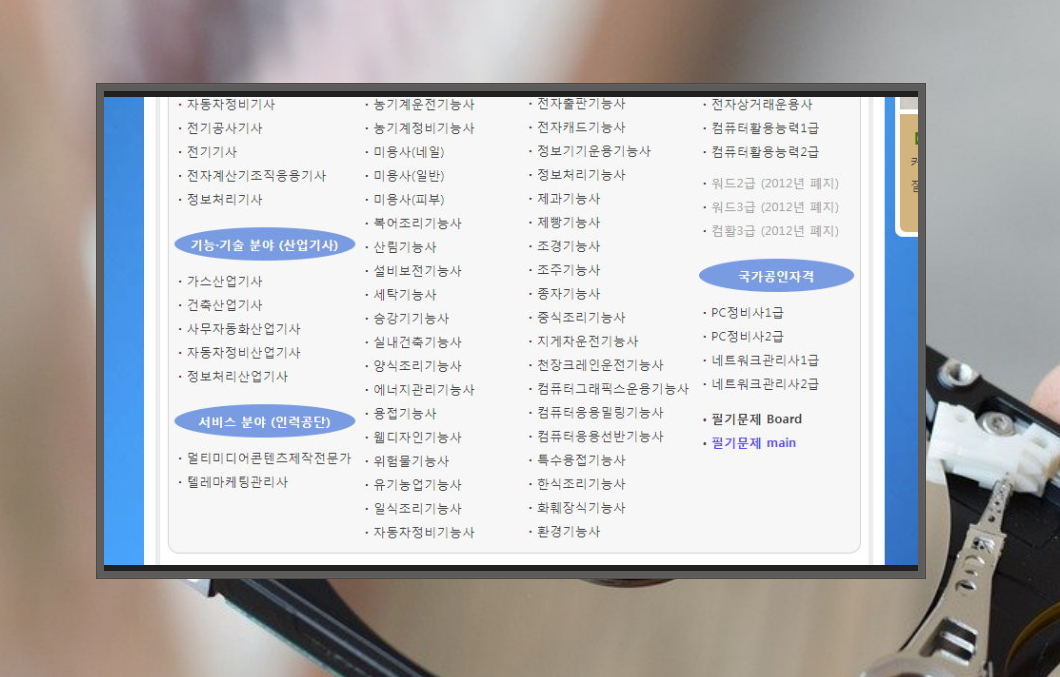 건시스템에 접속하면 굉장히 많은 기능사 자격증을 다루고 있다는 것을 알 수 있습니다. 우리가 찾는 응용밀링기능사는 오른쪽 아래에 있습니다.