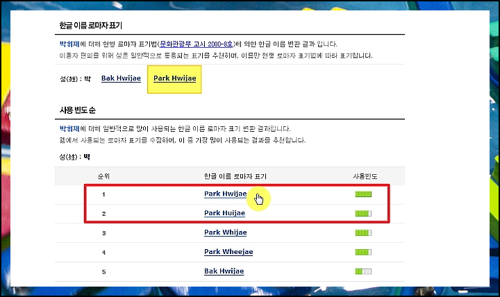 결과가 나왔습니다. 일단 문화관광부 고시 2000-8호를 따르는 결과 2개와 실제로 사람들이 많이 사용하는 영문 표기가 나타나는데요. 이렇게 2가지 결과물에서 중복이 되는 것을 사용하는 것이 좋습니다. 추가적으로 사용 빈도 순에서 빈도가 높은 것을 이용하면 되는데요. 여기서 올바른 영문자를 얻기 위한 추가 사용법을 알려드리겠습니다. 순위에 있는 로마자 중에서 상위권에 있는 것을 차례대로 하나씩 클릭해 보세요.