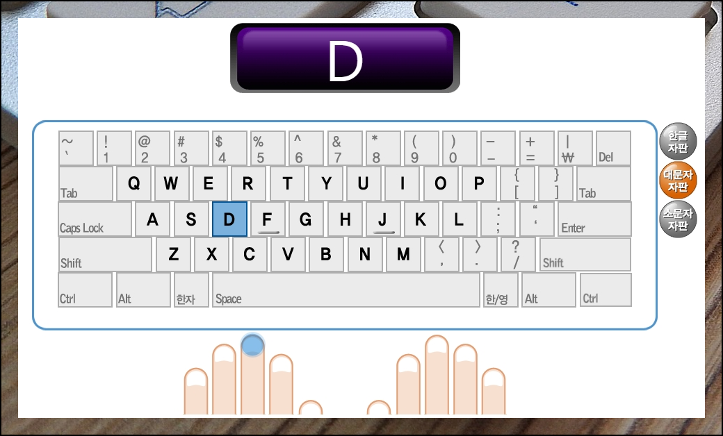 영어 자판에 대한 자리 연습을 진행해 보세요. 키보드와 손가락 그림이 나오고, 어떤 버튼을 어떤 손가락으로 눌러야 하는지 하이라이트 표시가 되고 있습니다. 영어의 경우에는 대문자와 소문자 자판 모두 익힐 수 있으니 두 가지 모두 이용해 보세요.