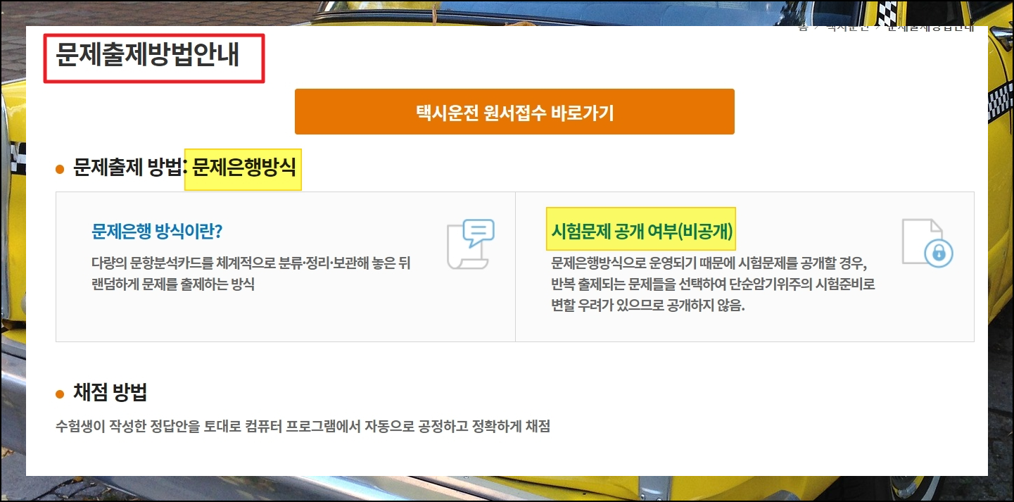 택시운전 자격시험의 경우에는 문제은행 방식으로 출제가 됩니다. 그렇기 때문에 기출문제를 많이 풀어본 사람이 합격하기 유리한데요. 그렇기 때문에 "비공개"가 되고 있다고 하네요.