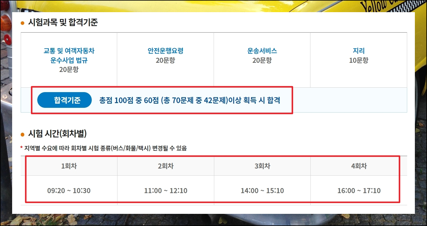 시험 준비를 시작하기 이전에 이전에 몇 점을 맞아야 합격을 할 수 있는지 확인하는 것은 필수에요. 총 70개의 문항으로 이루어져 있는데요. 여기에서 42개의 문항을 맞추면 합격이에요. 총점 100점에서 60점 이상을 맞으면 되는 거죠. 택시운전 자격시험은 70분 동안 진행이 되는데요. 한 문항을 1분 이내에 푸는 연습을 하셔야 됩니다.