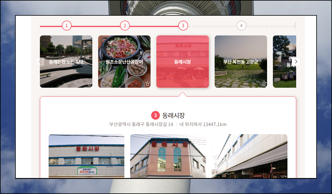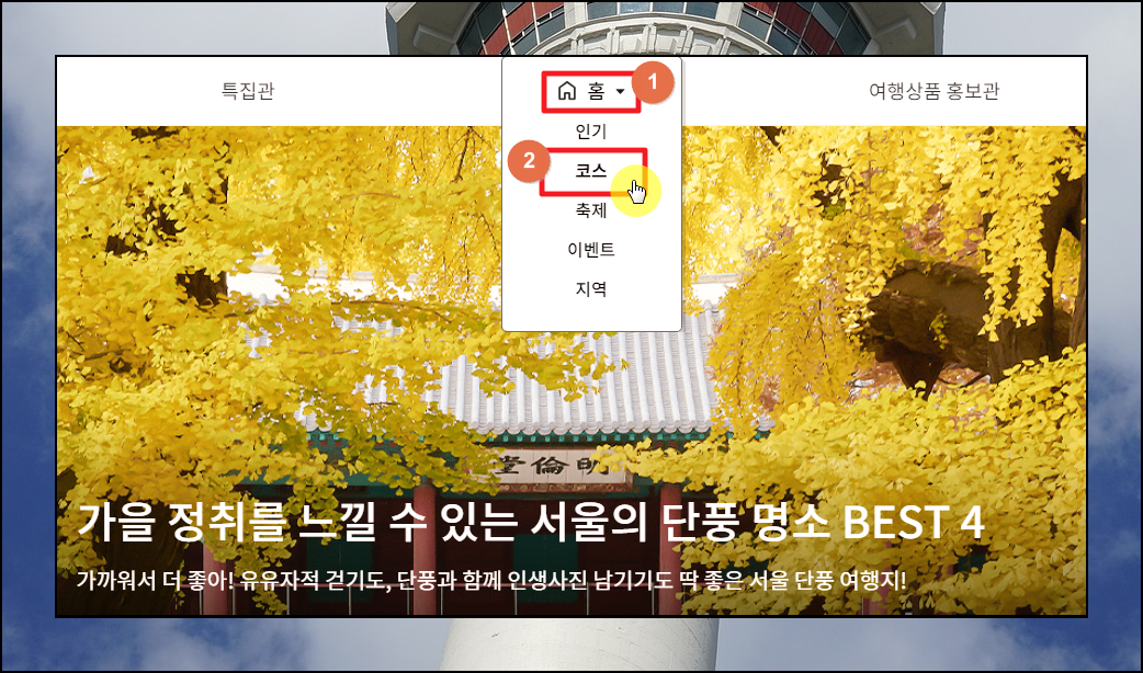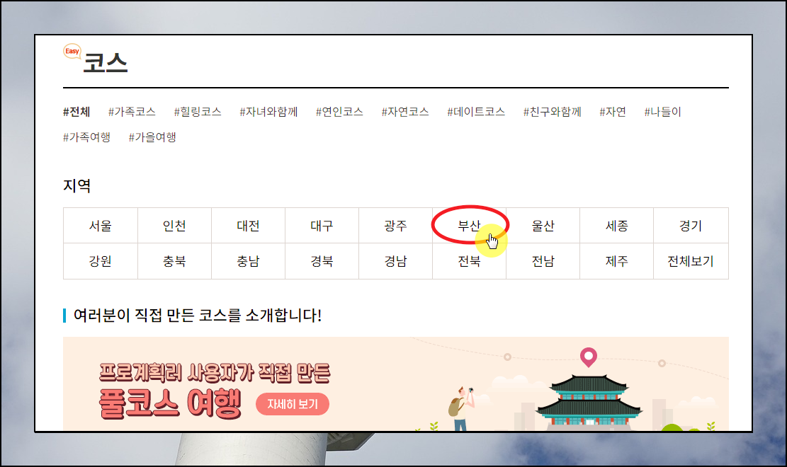 부산 여행코스 추천 및 상세 내용을 살펴보고 싶다면 사이트에서 [홈]과 [코스] 메뉴를 선택합니다.