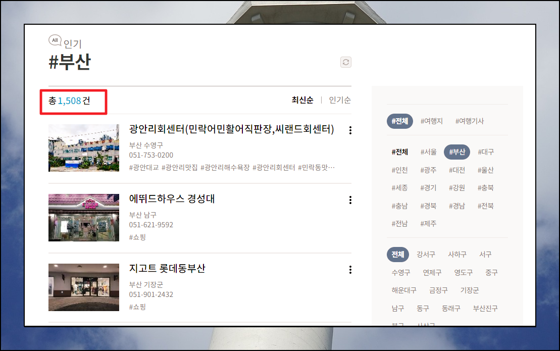이곳에서는 부산 뿐만 아니라 서울, 인천, 대전, 대구, 광주, 울산, 세종, 경기 등 전국 방방곳곳의 관광 정보를 풍부하게 제공하고 있습니다.