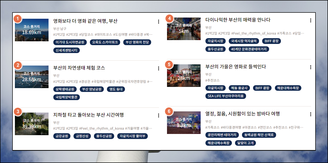 해당 사이트에서는 제가 앞서 언급한 6개를 포함하여 총 24건의 부산 여행 코스를 추천해주고 있는데요.