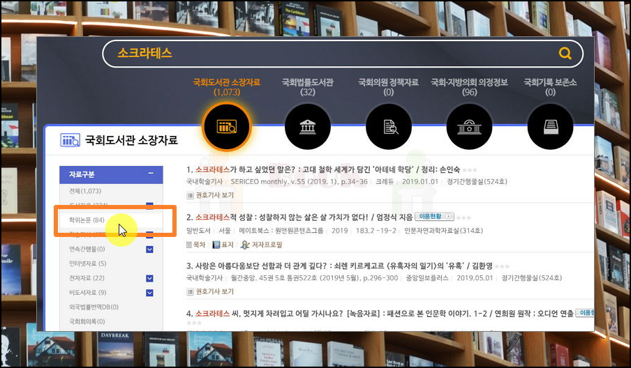 홈페이지 매인화면에 있는 검색창을 통해 소크라테스에 대한 자료를 조회해 보았어요. 도서, 비도서, 학위논문, 학술기사, 연속간행물, 인터넷 등 수 많은 자료가 나타나는데요. 여기서 논문만 따로 보고 싶다면 좌측에 있는 자료구분에서 [학위논문]을 클릭하시면 돼요.