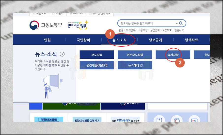 고용노동부 사이트에 접속하면 뉴스 및 소식 메뉴를 클릭합니다. 보도자료, 언론보도설명 등의 하위 메뉴가 나타납니다. 여기에서 "공지사항"을 클릭해야 근로계약서 양식을 다운 받을 수 있는 게시판으로 이동할 수 있습니다.