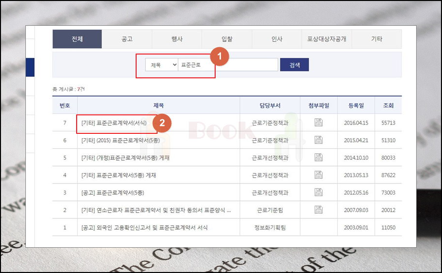 공지사항 게시판에서는 다양한 게시물을 담고 있습니다. 제목 기준으로 표준근로계약서를 검색합니다. 그럼 앞서 언급한 계약서 양식을 다운로드 받을 수 있습니다.