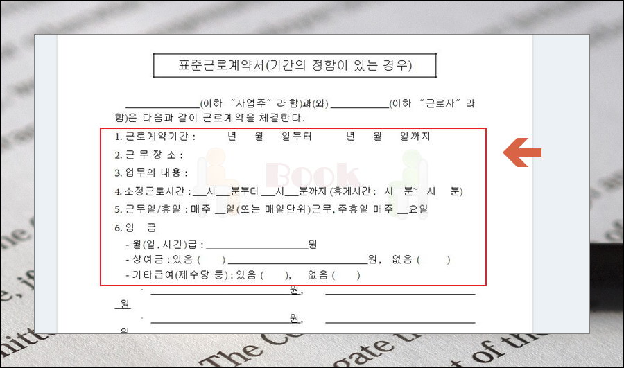 근무하는 기간이 정해져 있는 수습 직원의 경우 근로계약기간을 정확하게 기재해야 합니다. 아래 첨부한 표준근로계약서에는 이에 관한 항목을 포함하고 있습니다. 이외에 채용 시 필수적으로 협의가 되어야 하는 근무장소, 업무 내용, 시간, 근무일 및 휴일, 임금 등의 항목으로 구성되어 있습니다.