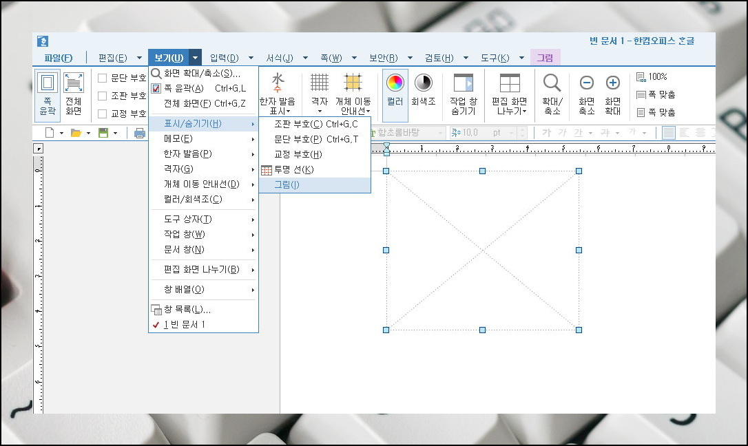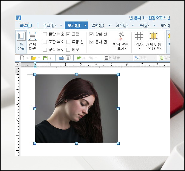 한글에 사진을 추가하던 사진이 추가된 파일을 열면 이렇게 나옵니다. 이럴 때에는 메뉴에 있는 보기를 클릭해 주세요.