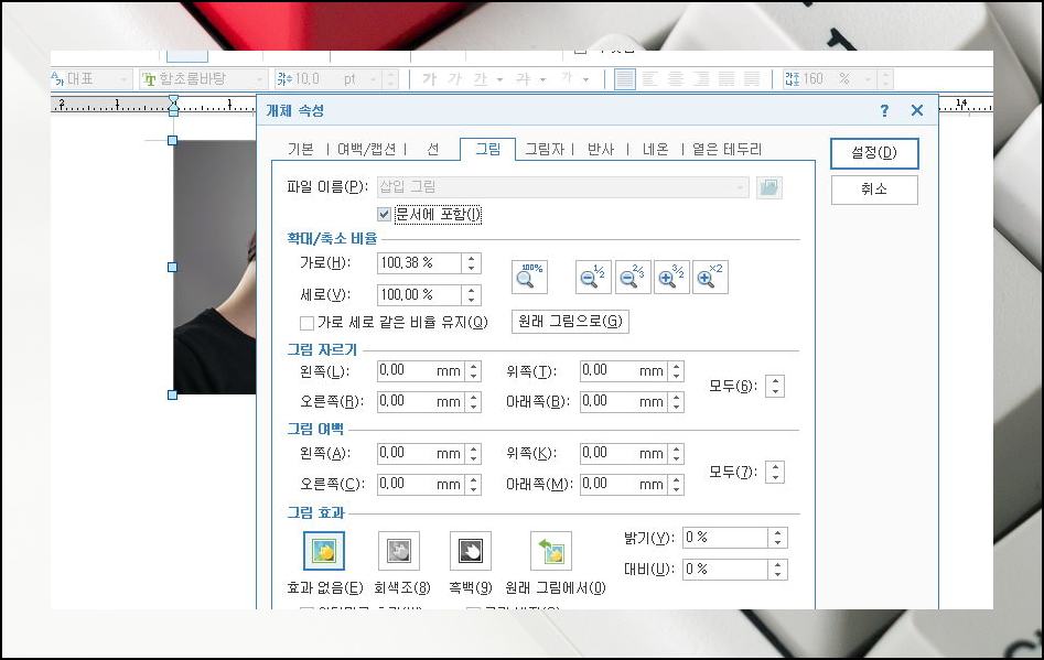 두 번째 방법 또한 간단합니다. 이미지 박스를 클릭하여 개체 속성으로 들어갑니다. 여기에서 파일 이름 아래에 있는 '문서에 포함'에 체크해 주세요.