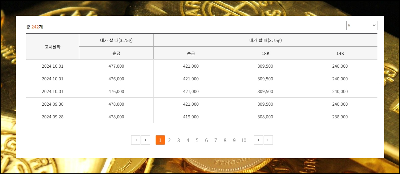 그래프 하단에는 이렇게 금을 팔 때와 팔 때 가격을 확인할 수 있어요. 오늘의 시세를 보아하니 판매할 때 금액이 14k는 240,000원, 18k는 309,500원, 순금은 421,000원이네요. 1돈 3.75g 기준이에요.
