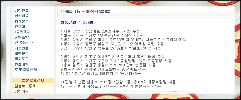 1등 판매점의 구체적인 주소구매 방식(자동/수동)을 확인할 수 있는데요. 보시는 바와 같이 상호명과 주소지도 자세하게 나와 있기 때문에 명당 찾으러 쉽게 갈 수 있습니다.