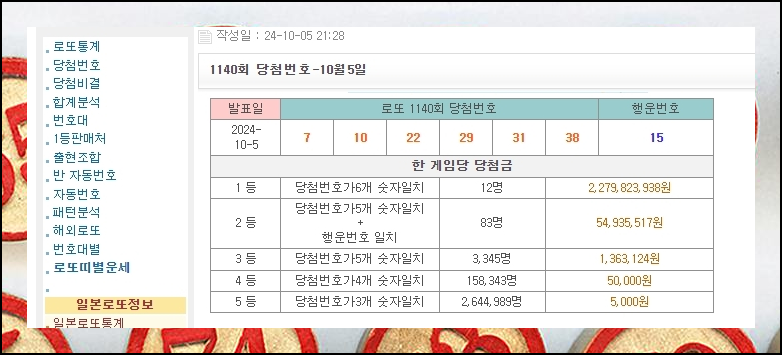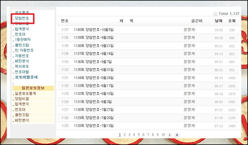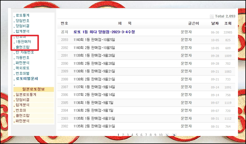 새 페이지에서 좌측의 [당첨 비결] 메뉴를 통해 로또당첨번호 전체모음 조회를 할 수 있어요. 각 회차의 상세 정보는 [당첨번호] 게시판에서 선택하면 됩니다. 게시판에서 알아보길 원하는 회차를 선택해 보세요.