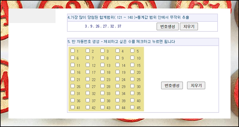 [반자동 번호] 메뉴에서 통계 기반 생성기를 이용해 보세요. 홀짝 통계, 조합, 합계 범위 등 다양한 데이터를 활용한 숫자를 추천 받을 수 있는데요. 생성 버튼을 눌러 여러 번 시도할 수 있어요. 여기에 나온 숫자는 로또당첨번호 전체모음 데이터를 가지고, 여러 가지 유의미한 통계 지표를 만든 것을 바탕으로 나옵니다. 한 마디로 확률이 높은 숫자를 알려준다는 것이죠.