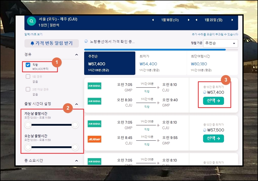 이번에는 비행기에 탑승하는 시각저가항공사를 선택할 수 있는데요. 제가 직접 이용해 본 바에 의하면 가까운 제주를 가는데 있어서는 어떤 곳을 이용하든 차이가 나지 않았습니다. 그렇기 때문에 금액 위주로 선택하면 되고요. 출발 시간대에 경우에는 사람마다 차이가 있기 때문에 자신이 원하는 시간으로 선택하면 됩니다. 여기까지 진행되었다면 마음에 드는 티켓을 발견하셨을 텐데요. 선택 버튼을 눌러 예매를 진행할 수 있습니다.