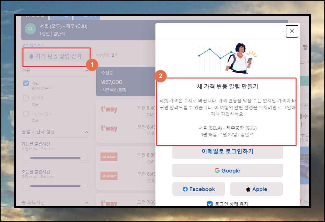 추가적으로 더 저렴한 티켓을 예매하고 싶다면 항공권 가격비교사이트의 "가격 변동 알림 받기" 서비스를 이용해 보세요. 저렴하게 나오는 티켓이 있을 때 알려줍니다.