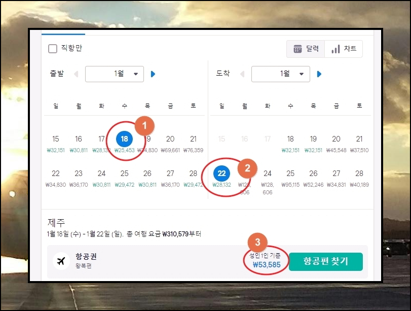 한 달 단위로 지정하면 이렇게 날짜별로 가장 싸게 예매할 수 있는 항공권에 금액이 표시가 됩니다. 여기에서 본인의 제주여행 스케줄을 참고하여 적당한 날로 선택해주세요. 다 선택했다면 항공편 찾기 버튼을 누르면 됩니다.