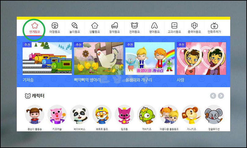 동요 페이지에 접속하면 다양한 종류의 어린이 동요 연속듣기 할 수 있는데요. 인기곡, 애창, 생활, 놀이, 영어 등 정말 많습니다. 이번에는 인기곡을 들어볼게요.