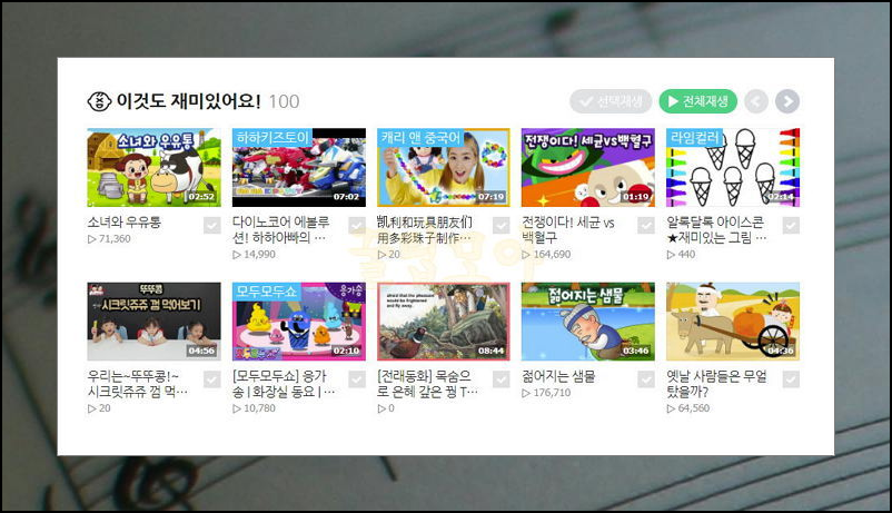 어린이 동요 외에도 다양한 컨텐츠가 아래에 나오는데요. 동화, 엔터테인먼트, 만화주제가 등 아이들이 좋아할만한 것들이 많습니다. 연속듣기 기능을 통해 일부 또는 전부 재생하실 수 있어요.