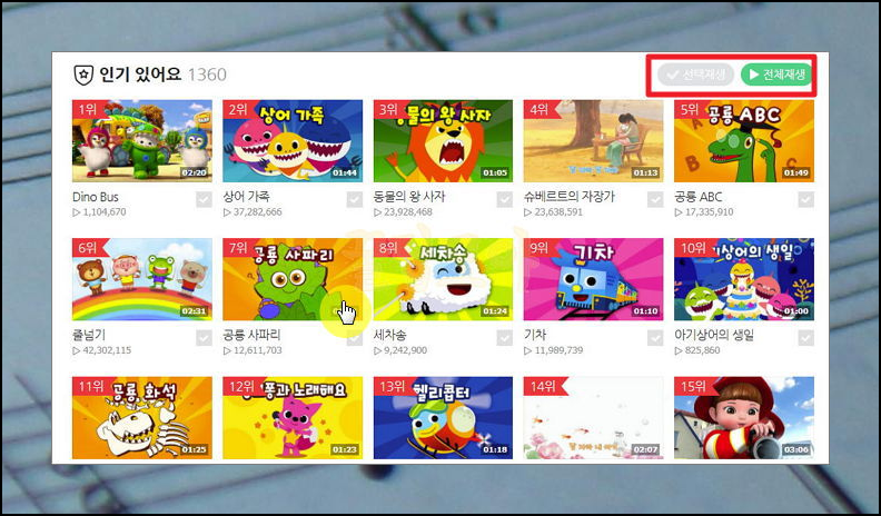 1360개의 무료 인기곡이 나타나는데요. 오른쪽 상단에 있는 선택재생과 전체재생 버튼을 통해 연속듣기 가능합니다. 한 곡을 연속 재생하는 것도 가능한데요. 공룡 사파리 동요를 틀어보겠습니다.